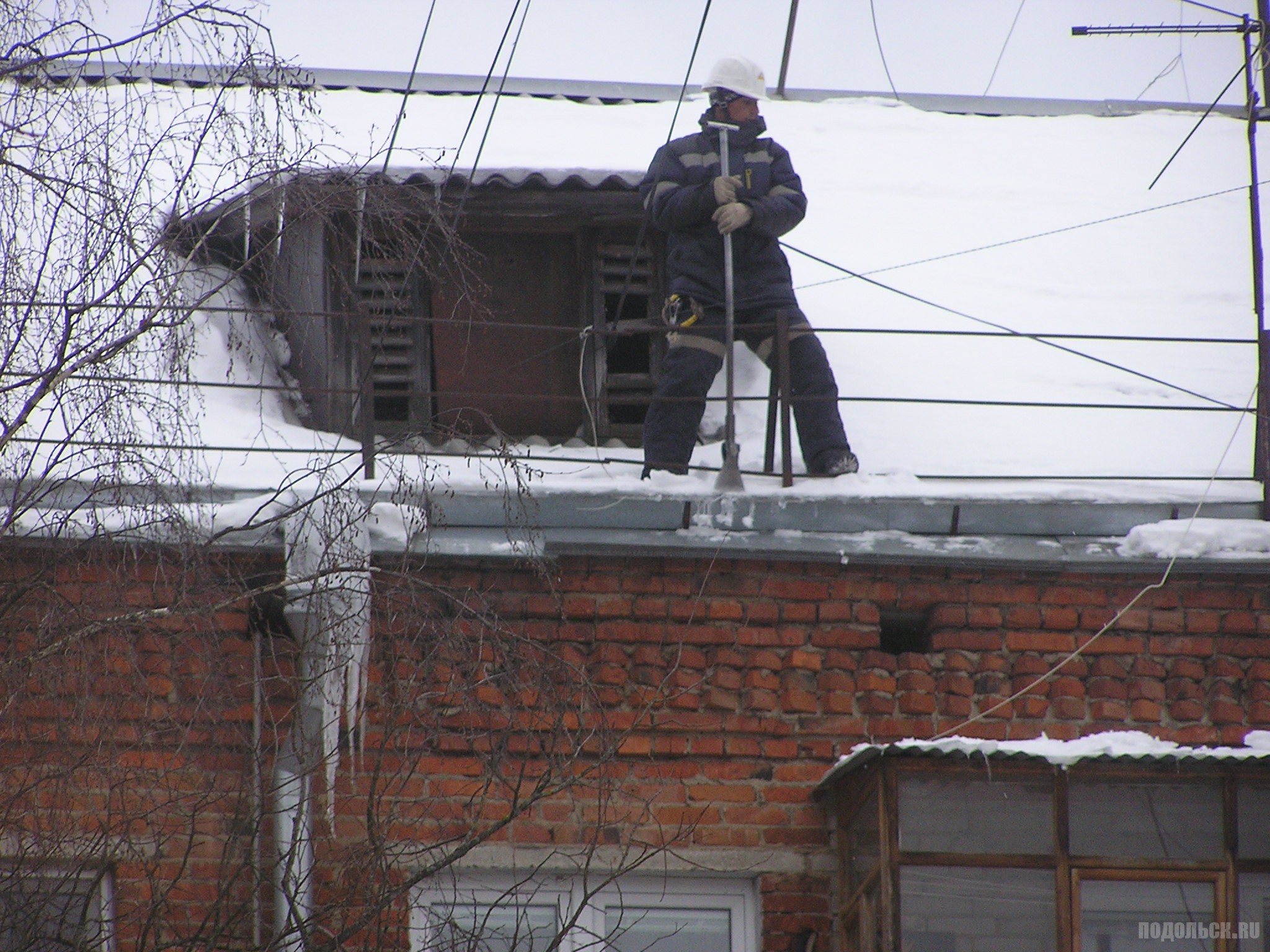 Альпинист скалывает лед на крыше. 4 февраля 2017 г.